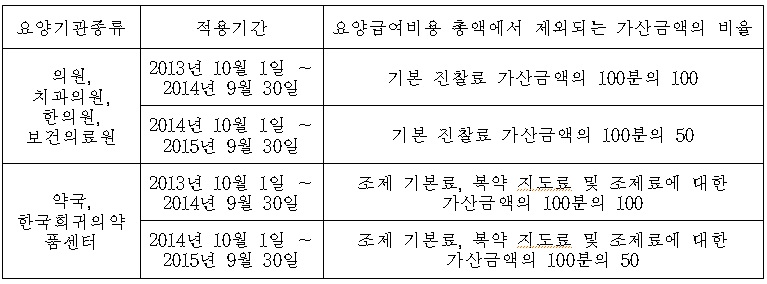 요양급여비용 총액(보건복지부장관이 정하여 고시하는 식대와 장애인 치과진료에 대한 가산금액은 제외하며, 토요일 오전 9시부터 오후 1시까지의 의원ㆍ치과의원ㆍ한의원ㆍ보건의료원의 외래 진찰 및 약국ㆍ한국희귀의약품센터의 조제에 대한 가산금액은 다음 표의 구분에 따라 한시적으로 제외한다. 이하 이 표에서 같다)