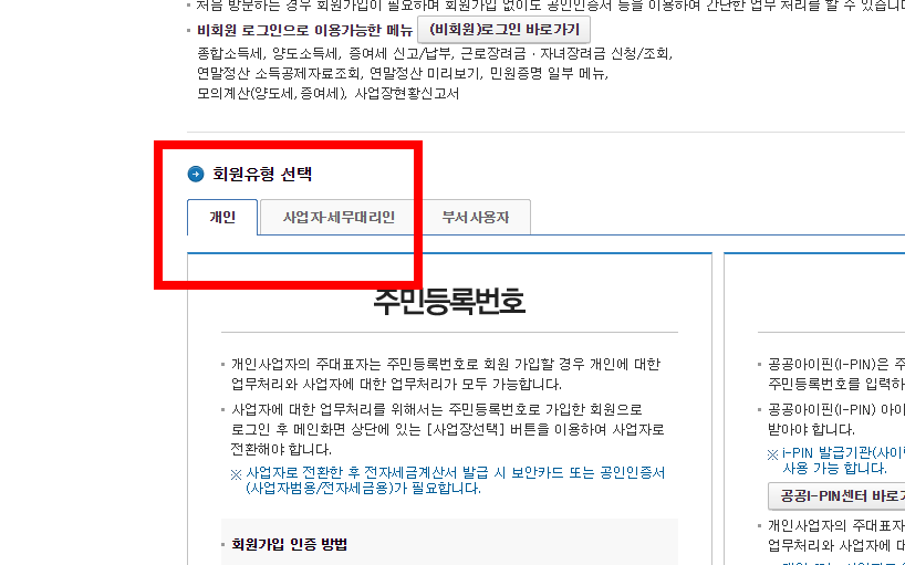 홈페이지 상단 공인인증서 센터-> 공인인증서 등록 -> 사업자 ( 개인, 법인, 세무대리인) -> 사업자 번호 입력후