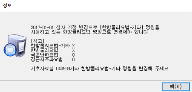 보험, 진료실 한방물리요법-기타 명칭 변경 안한경우 메세지가 추가 되었습니다.