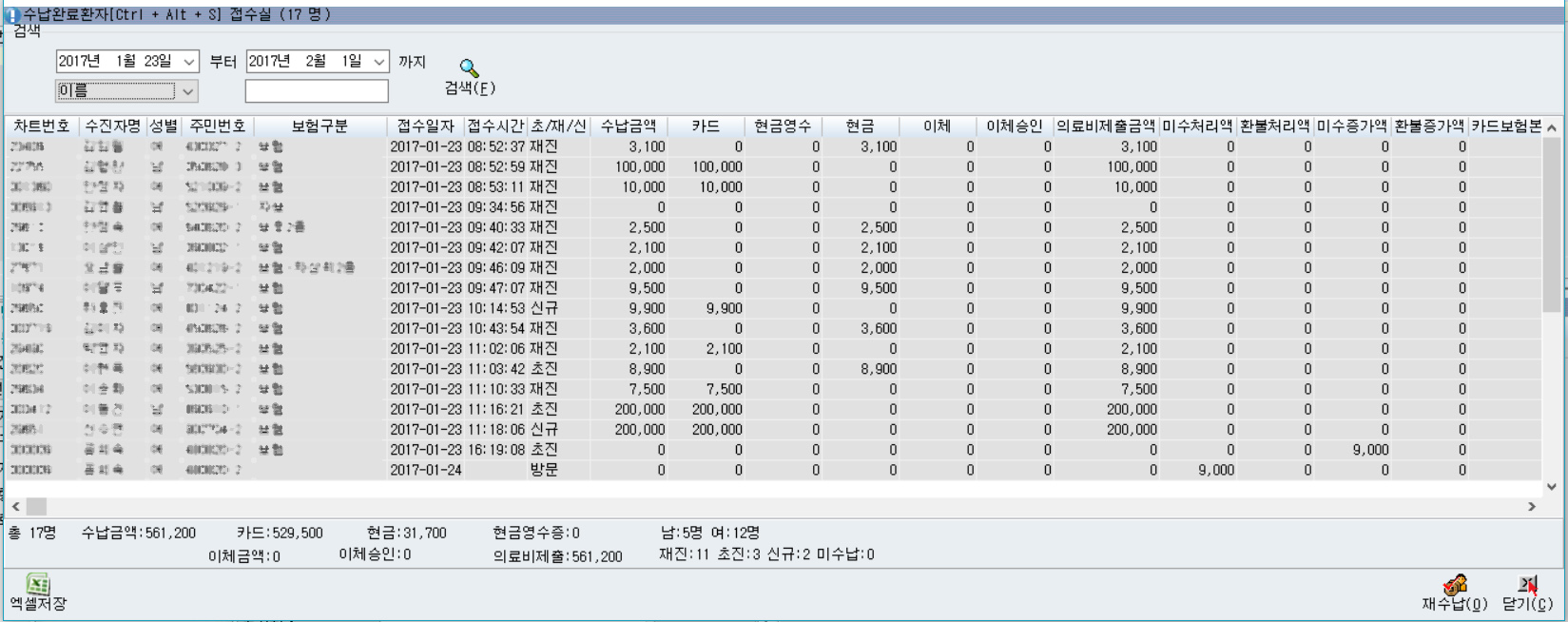 접수실 완료 환자로 일통계로 활용할 수 있도록 수납, 미수금내역 조회 기능이 추가되었습니다.