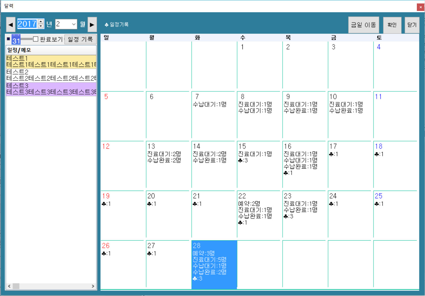 접수실 날짜변경 선택시 달력화면이 일자별 진료대기 수납대기 예약환자 항목을 확인할 수 있도록 변경되었습니다.