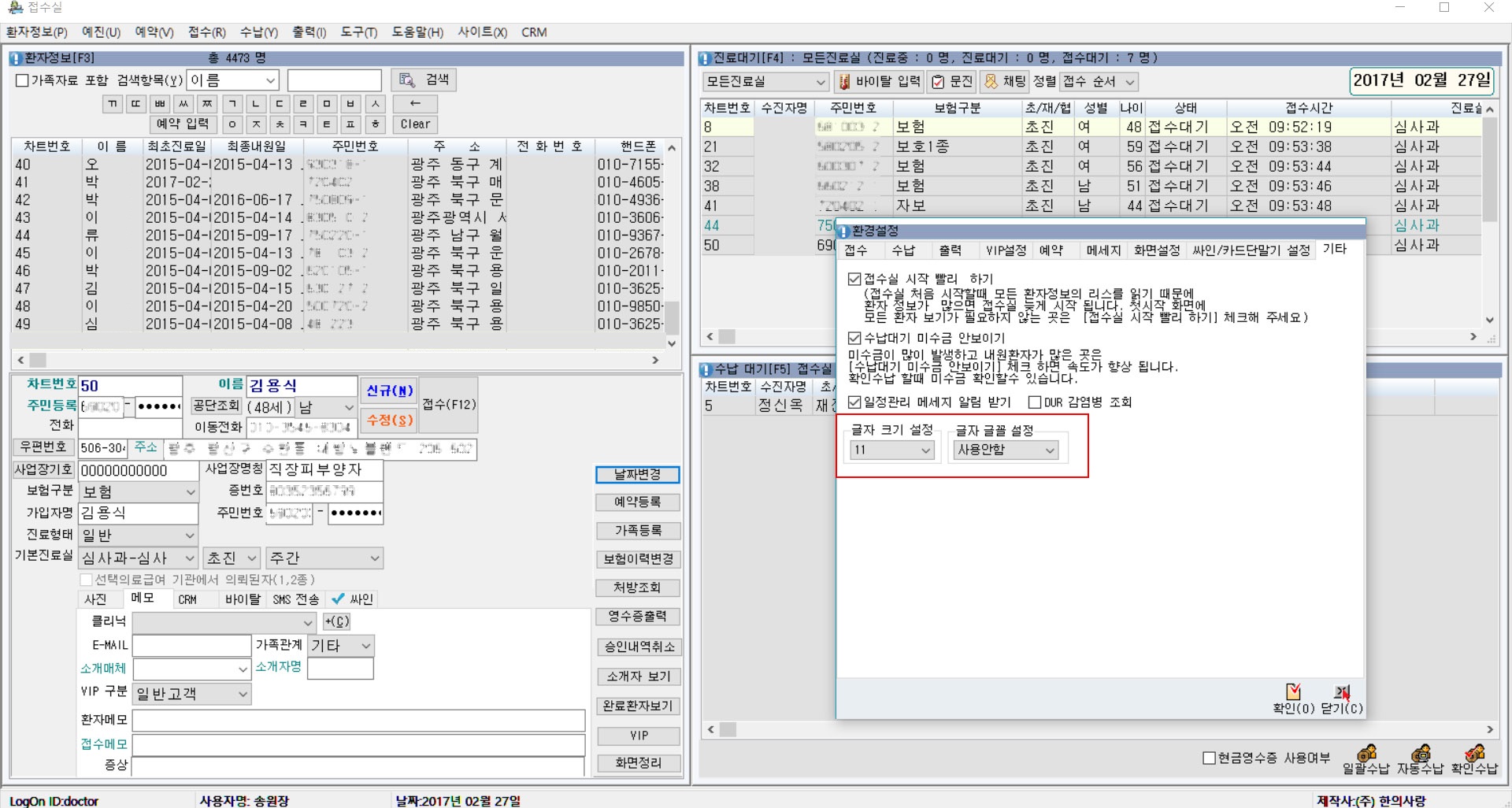 접수실 -> 도구 -> 환경설정 -> 기타 글자 크기설정및 글자 글꼴 설정옵션을 선택할 수 있습니다.