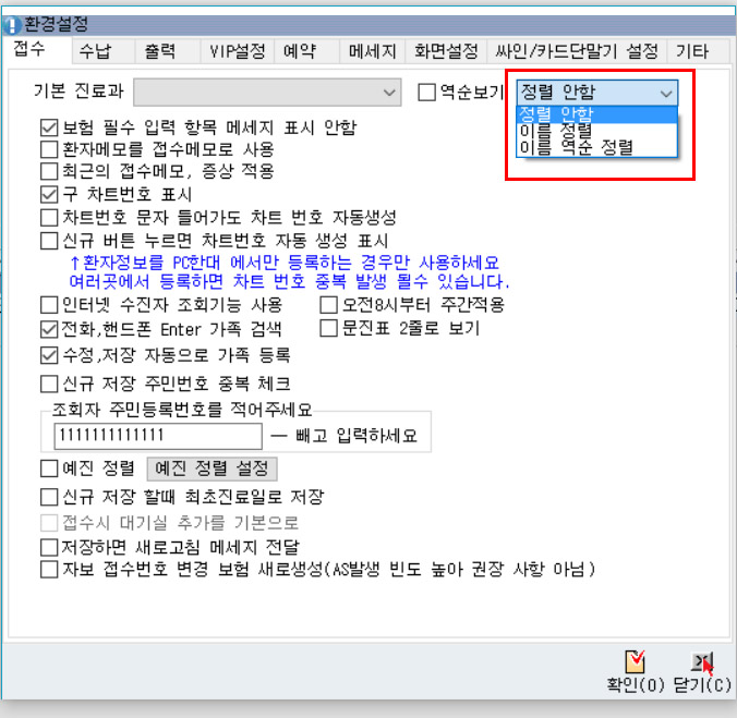 * 접수실 환경설정 에서 [역순보기]가 체크되있으면 정렬이 적용되지않습니다.