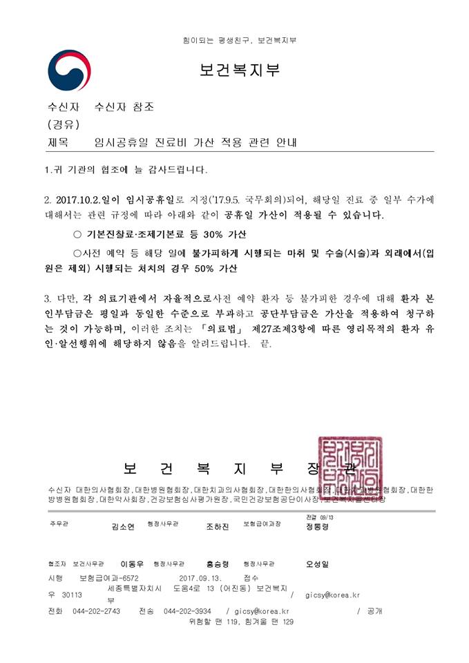 2017년 10월 2,6일 임시,대체공휴일 진료비 가산 적용안내