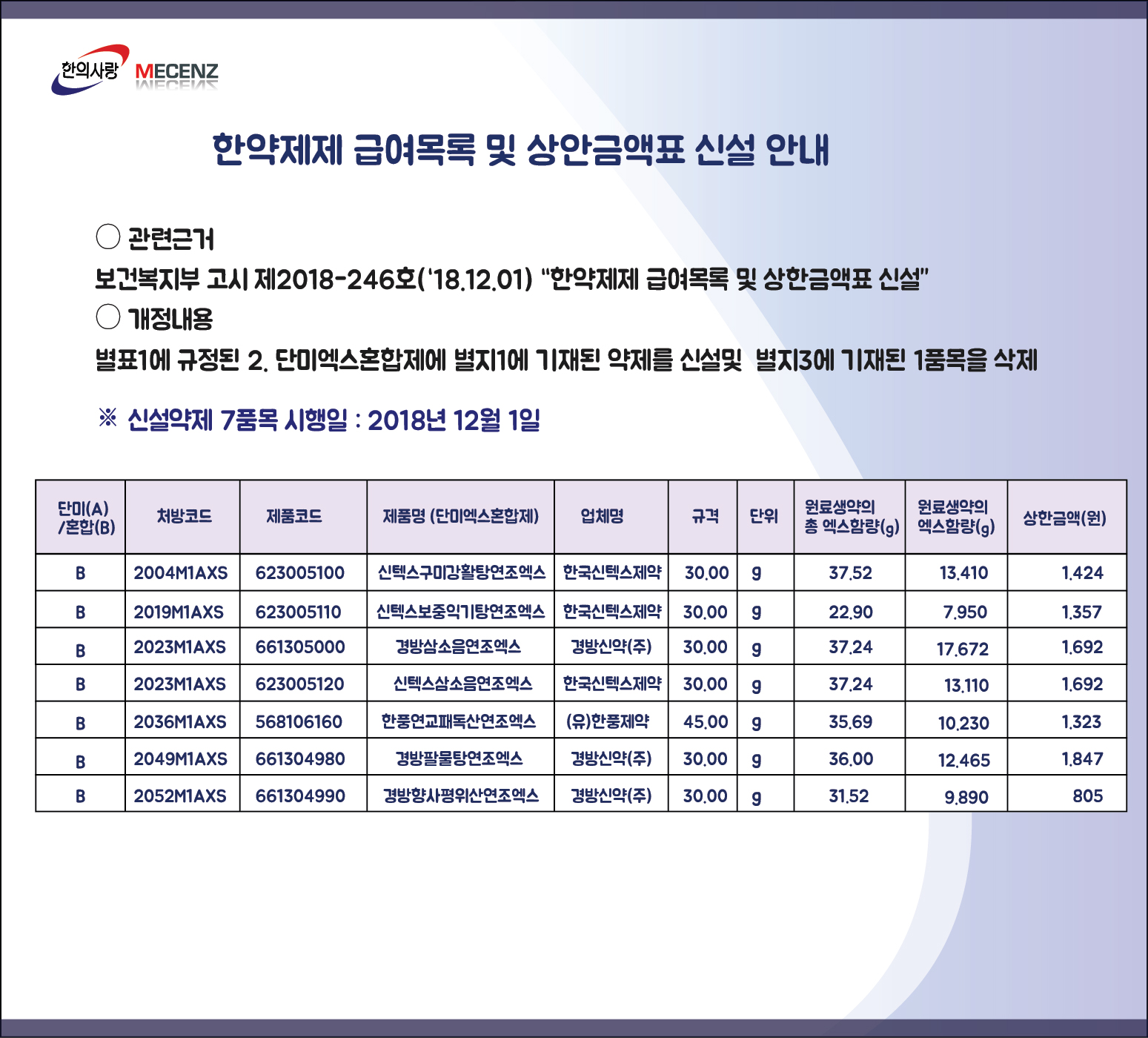 [팝업] 2018년 12월 1일 한약제제급여목록 및 상안금액표 개정고시