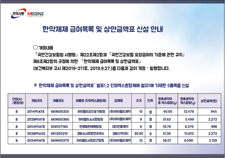 [팝업] 2019년 11월1일 한약제제급여목록 및 상안금액표 개정고시