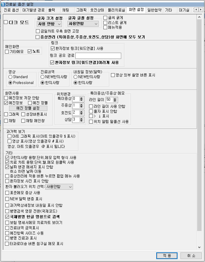 접수, 진료실 도구 -> 환경설정 화면구성이 개선되었습니다.