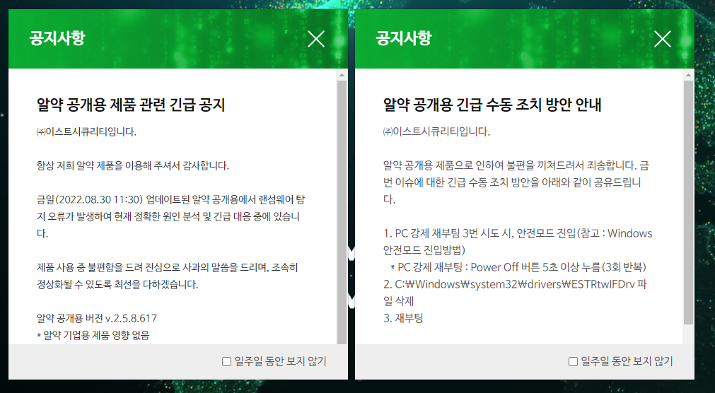 알약 공개용 제품 관련 공지 - (알약 공개용 긴급 수동 조치 방안 안내) -자세한 사항은 알약측으로 연락 요망