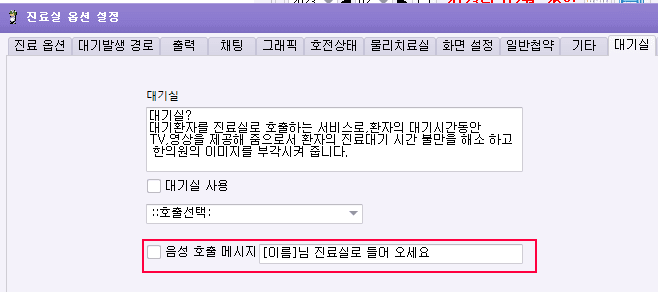 음성메시지 수정 -> 진료실 환경설정 대기실 -> 음성 호출 메시지 체크