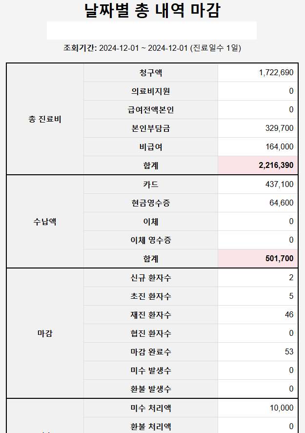 총진료비, 수납액, 미수 환불, 결제 구분, 산정액을 쉽게 확인할 수 있도록 개선했습니다.