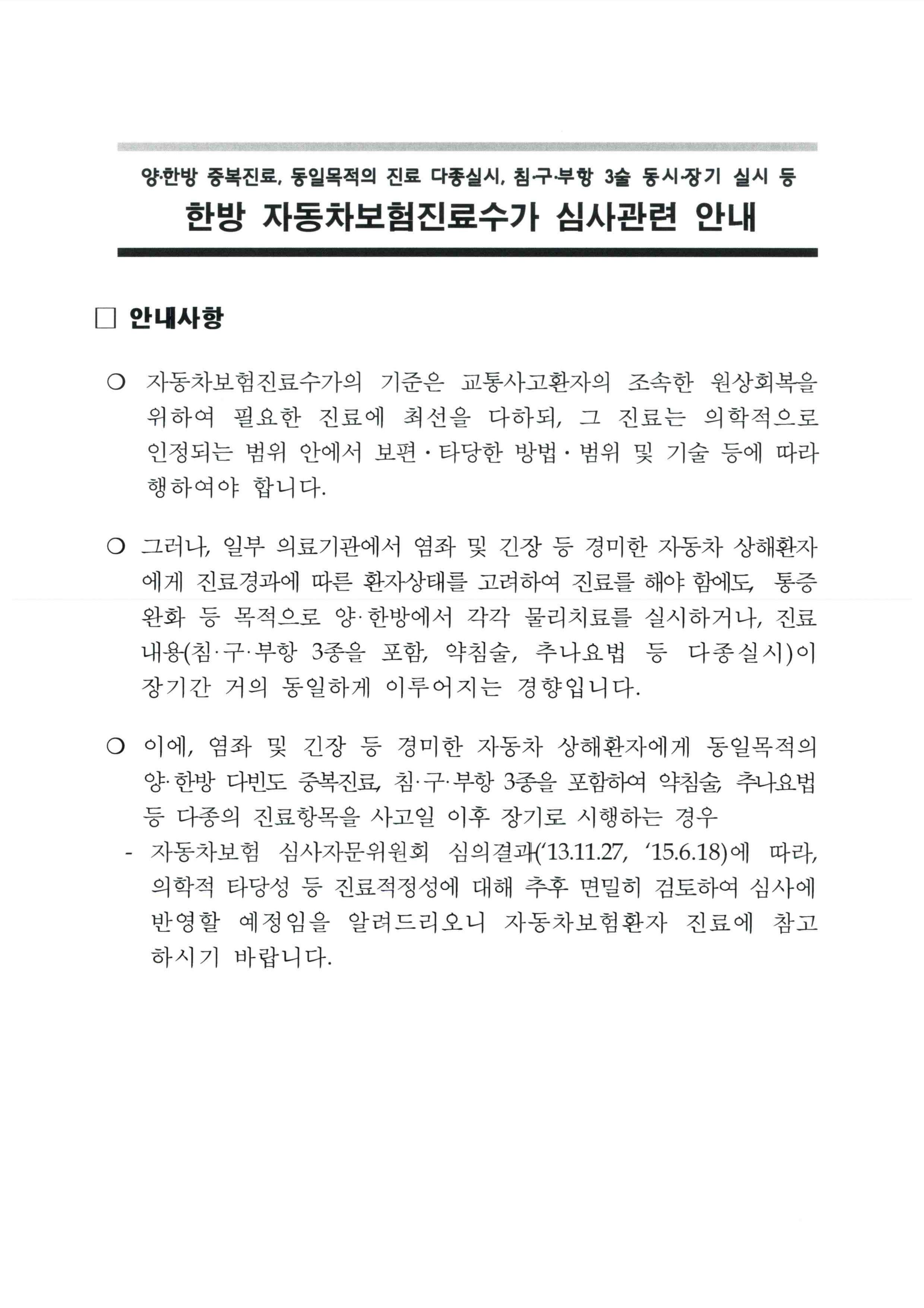 다종의 진료항목에 대한 한방 자동차보험진료수가 심사관련 안내입니다.