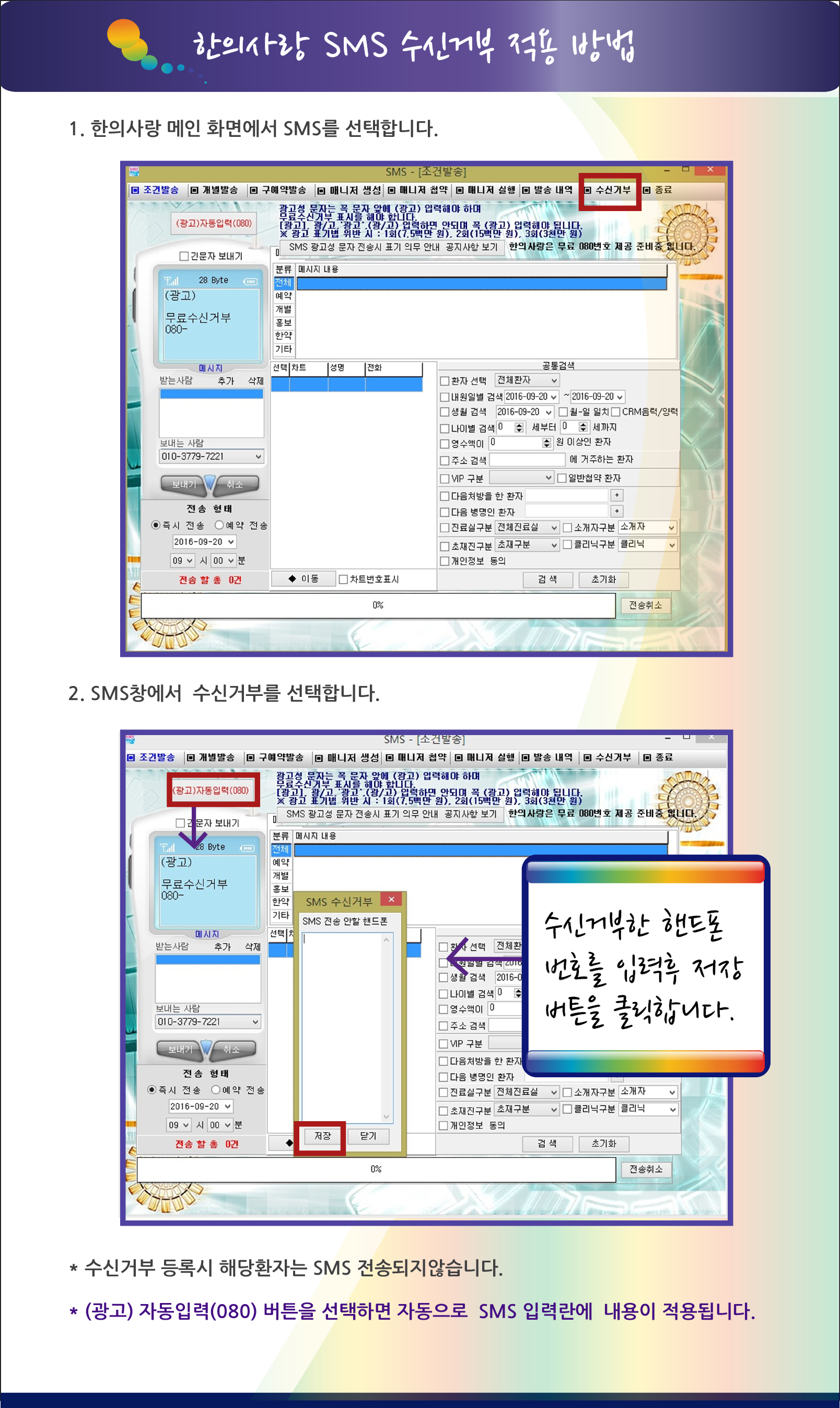 * 한의원내 SMS 수신거부 적용방법 ( 080 무료수신거부 와 별도 )