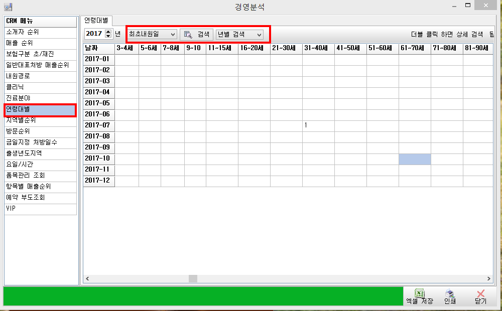 옵션선택후 검색하면 연령대별 진료한 환자의 수가 나타나며