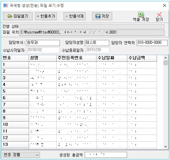 생성된 파일을 보거나 수정할 경우 [국세청 생성파일 보기,수정] 에서 작업합니다.