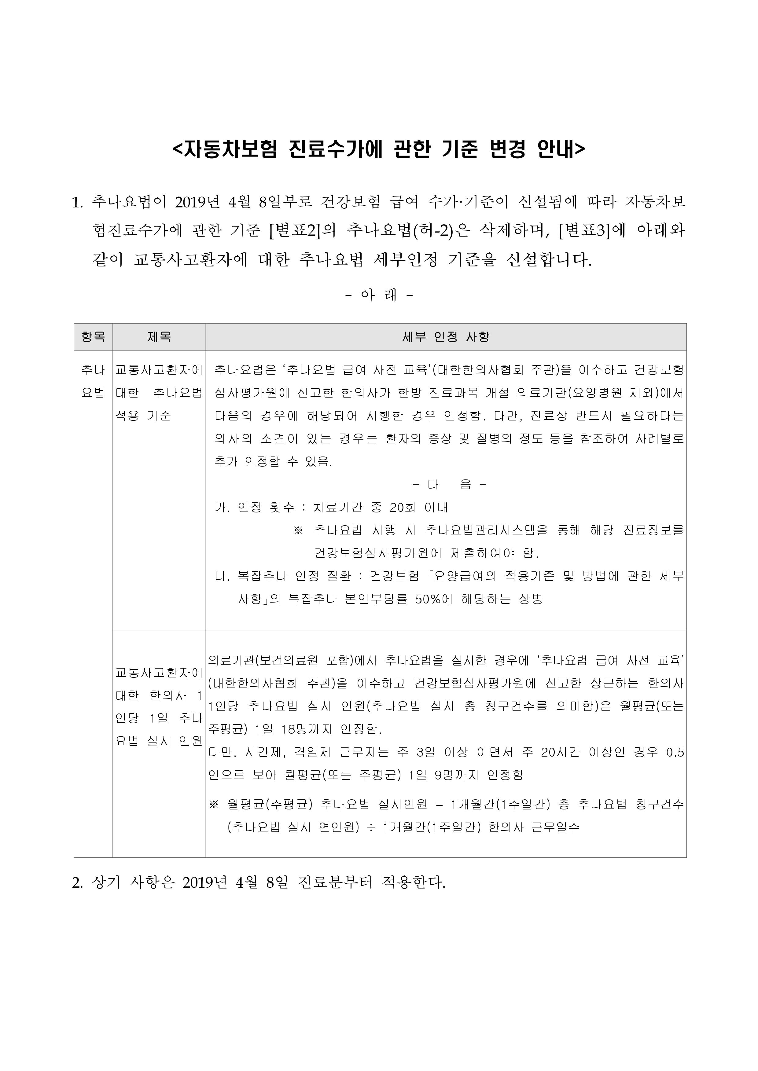 자동차보험 추나요법에 대한 산정기준 알림