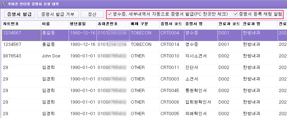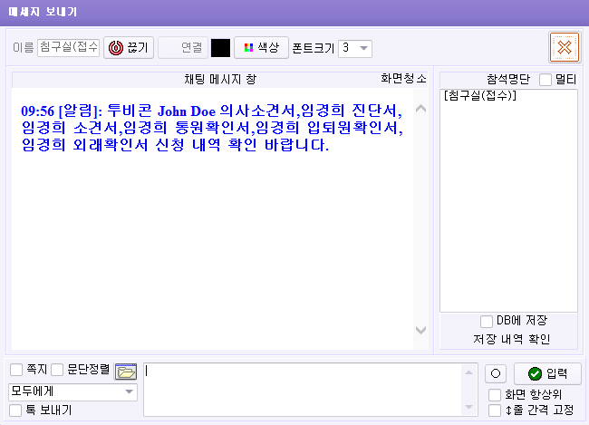 증명서 등록 채팅 알림(PC 한곳만) 체크 하면 소견서, 진단서, 통원확인서등