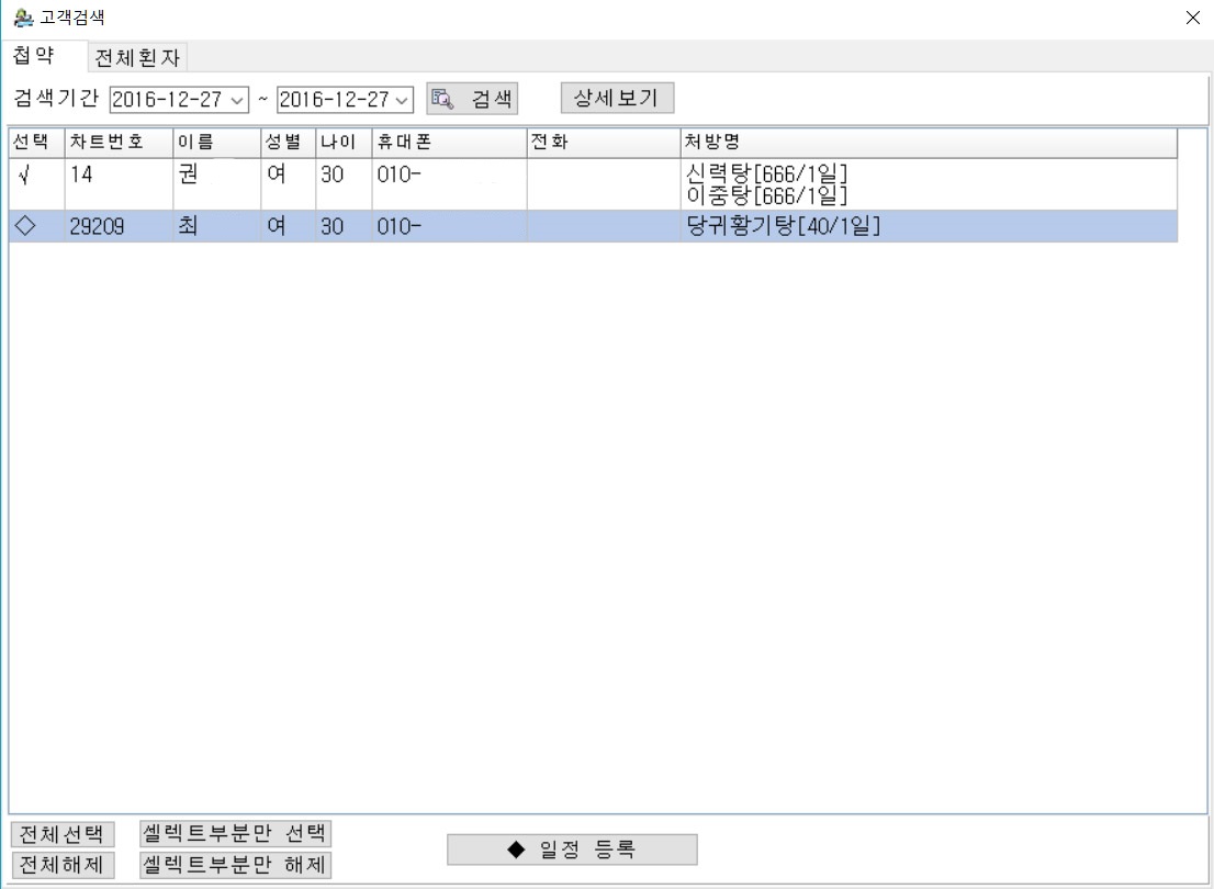 예약창에서 환자 검색시 동명이인인경우 최종내원일 정렬로 최근 진료한환자의 정보를 상단으로 검색이 가능합니다.