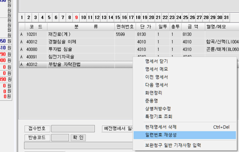 보험 누락청구, 보완청구시 일부 명세서 삭제시 일련번호 재생성옵션을 선택하면