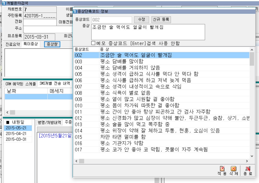 환자의 증상코드를 입력및 등록 할 수 있도록 기능이 추가되었습니다.