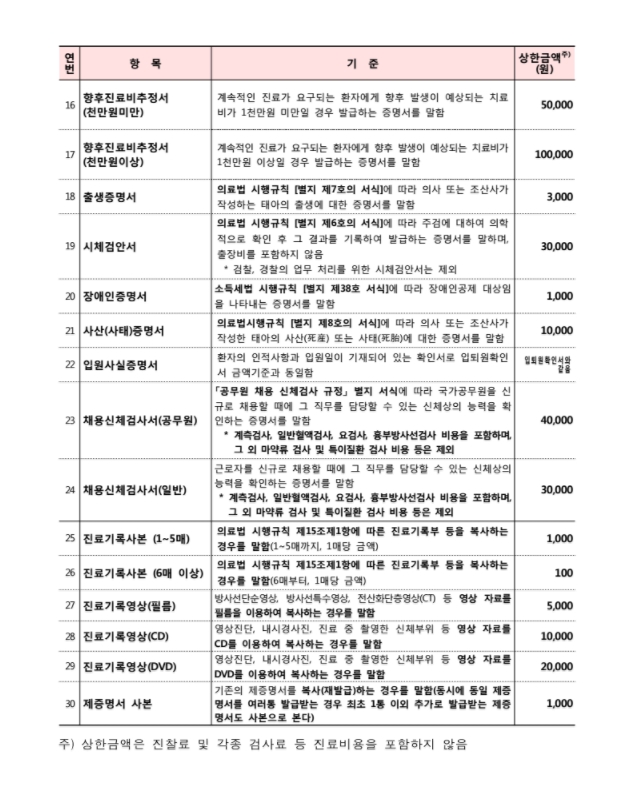 의료기관의 제증명 수수료 항목 및 금액에 관한 기준 안내