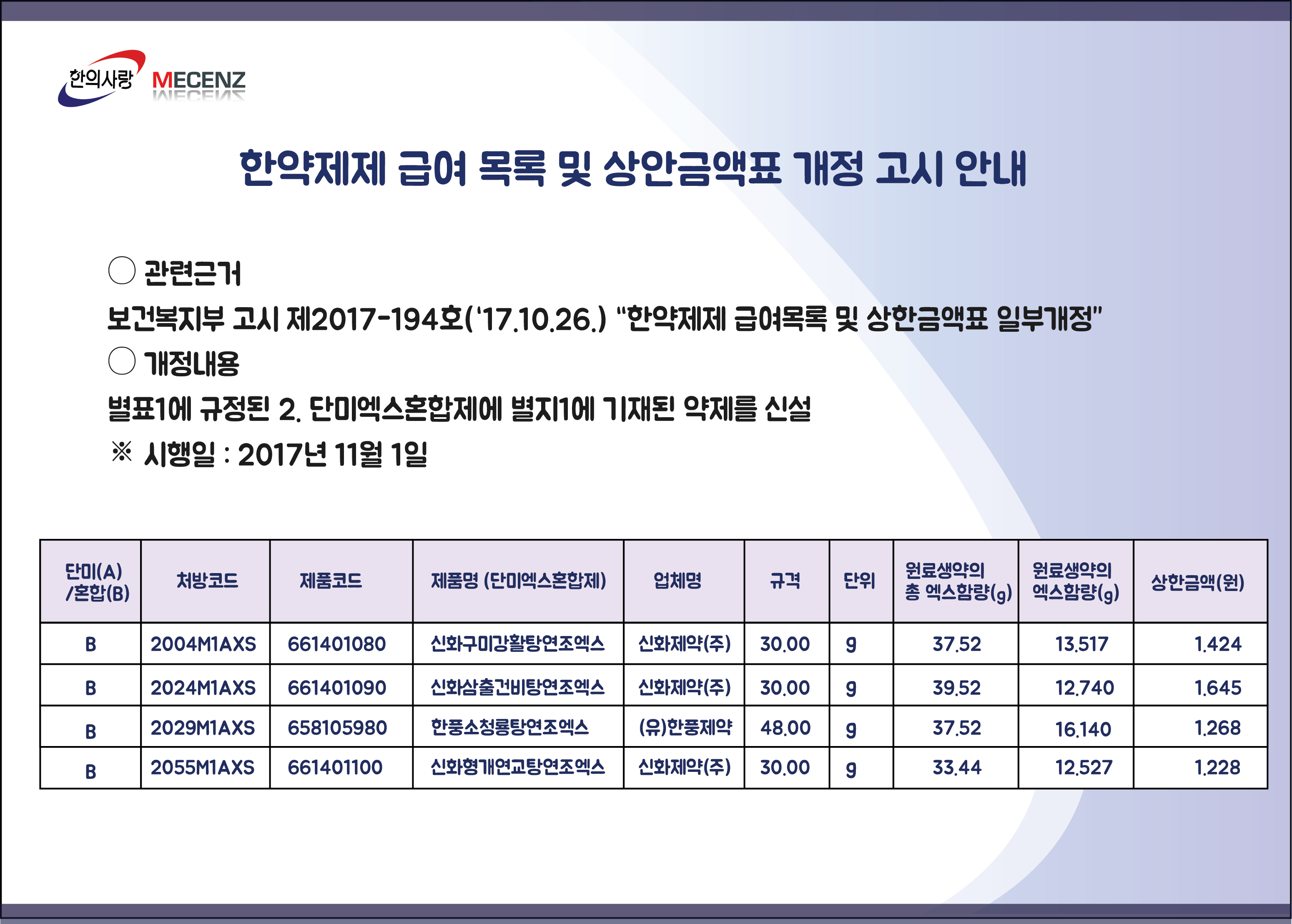 [팝업] 2017년 11월 1일 한약제제급여목록 및 상안금액표 개정고시 안내