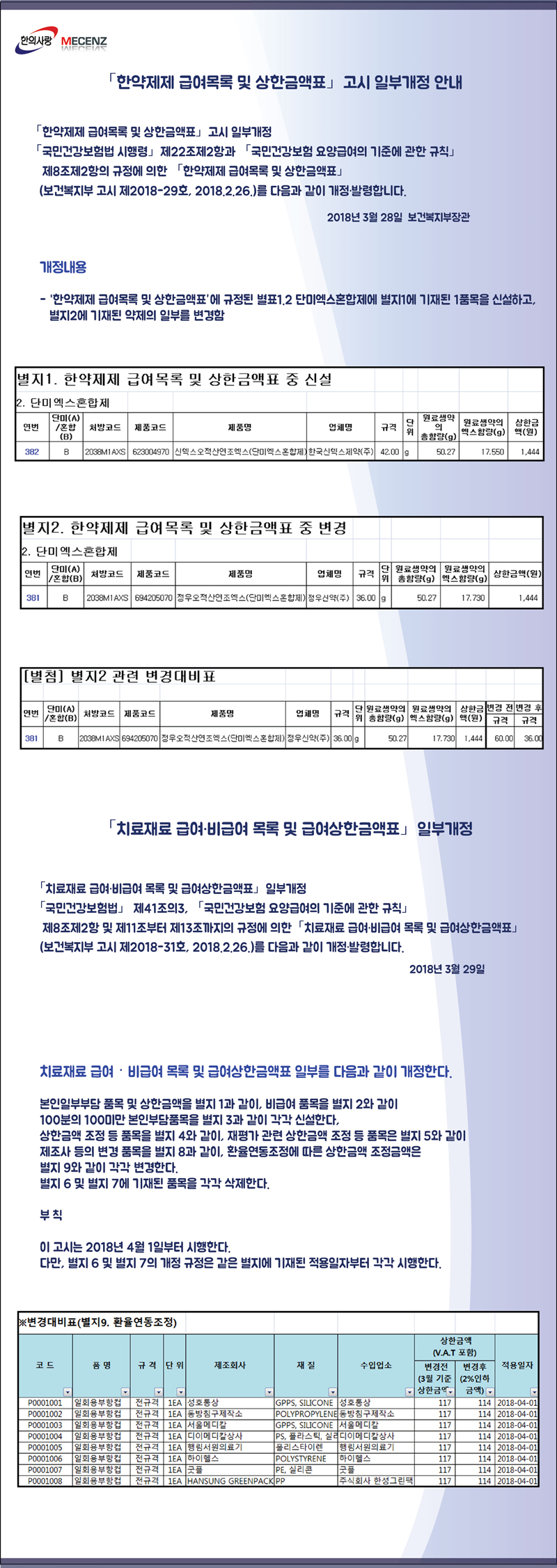 2018년 4월 1일 한약제제급여목록 및 치료재료 급여.비급여 목록 상안금액표 개정고시안내