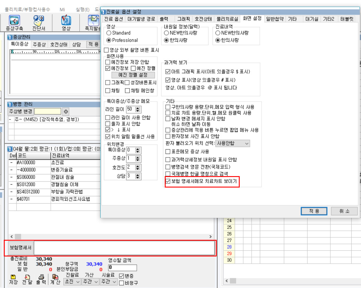 기존의 마우스 우클릭으로 선택할 수 있는 보험 명세서 기재메모를 치료차트에서 바로 확인할 수 있습니다.