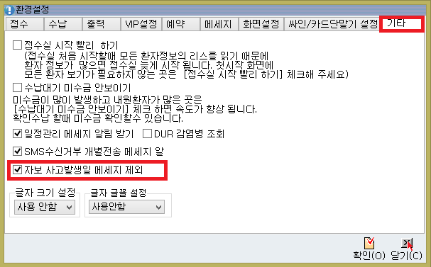 접수실 상단 메뉴 도구 -> 환경설정 -> 기타 -> 자보 사고발생일 메세지 제외 [체크]