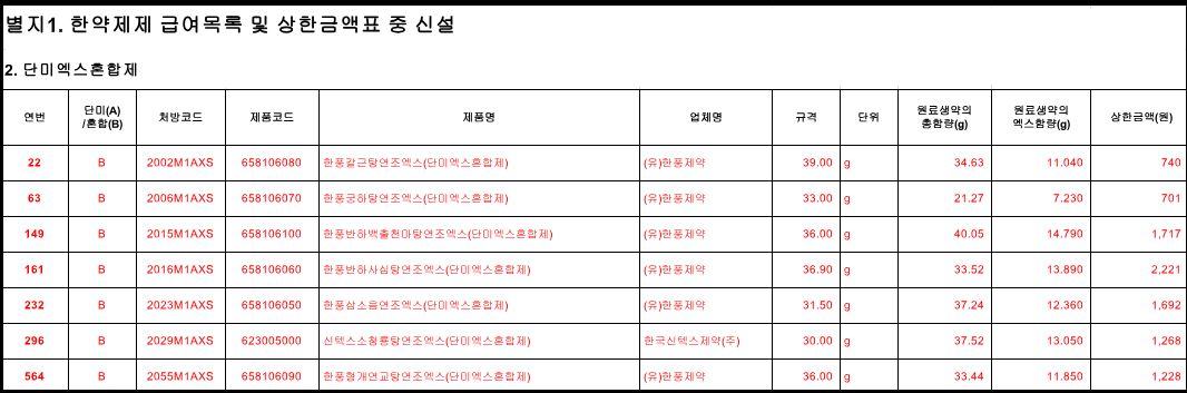 한약제제 급여목록및 상한금액표 일부개정 업그레이드 7월1일