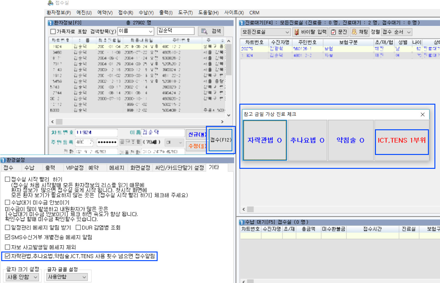 상단메뉴 -> 도구 환경설정 -> 기타 -> 자락관법, 추나, 염좌, ICT,TENS 횟수 넘으면 접수알림