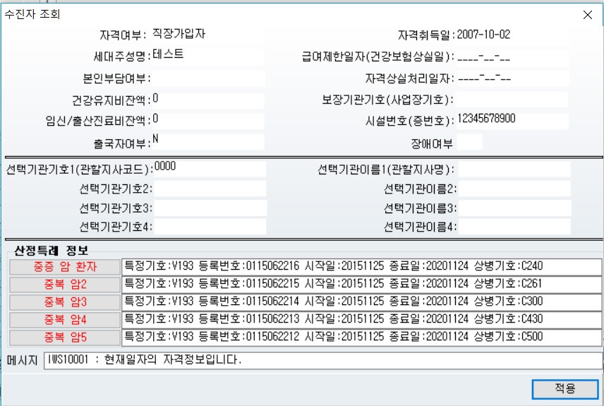 등록암환자, 치매환자, 희귀난치성 질환 재등록대상의 경우 공단조회시 병명이 하단정보창에 나오게됩니다.