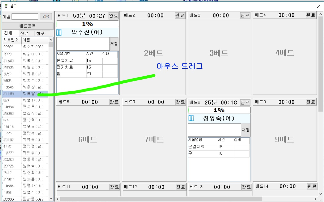 침구실 프로그램에서 대기환자를 마우스드래그를 통해 베드로 이동할 수 있도록 업그레이드 되었습니다.
