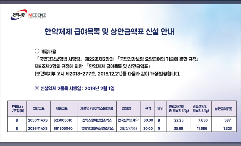 [팝업] 2019년 2월 1일 한약제제급여목록 및 상안금액표 개정고시