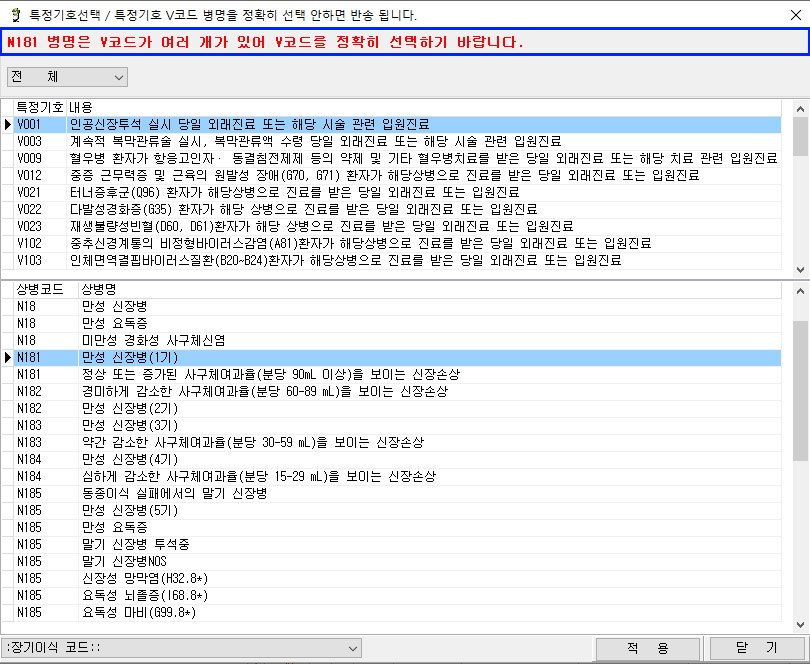 산정특례환자 진료시 V코드와 병명선택이 안되는 경우