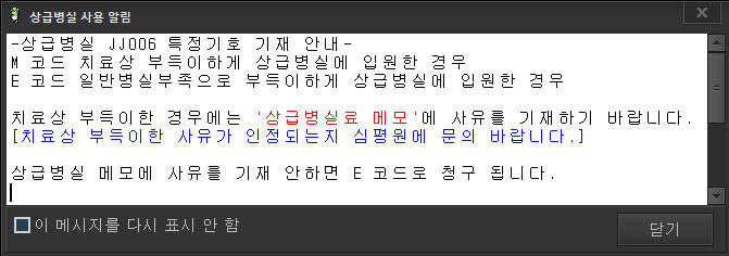 E코드로 보내라고 해서 E코드 '일반병실부족으로 부득이하게 상급병실에 입원한 경우' 자동으로