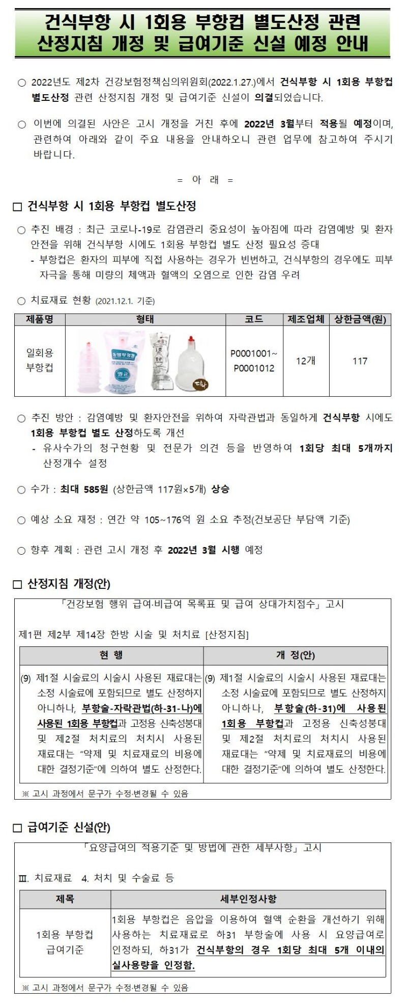 건식부항 시 1회용 부항컵 별도산정 관련 산정지침 개정 및 급여기준 신설 예정 안내