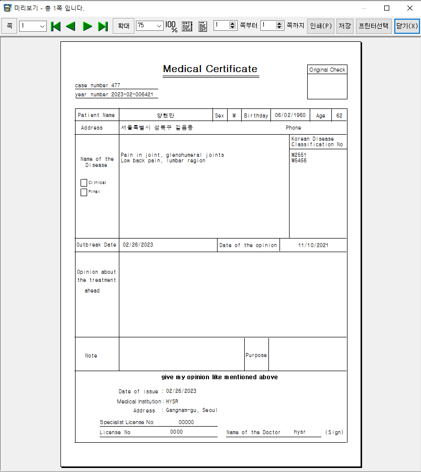 단일, 빌행일 날짜는 영문표기 발병일 직접수정해야합니다.