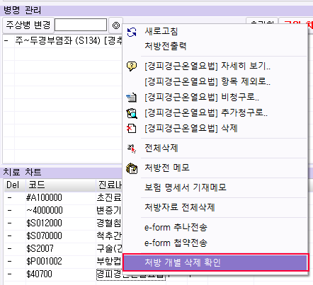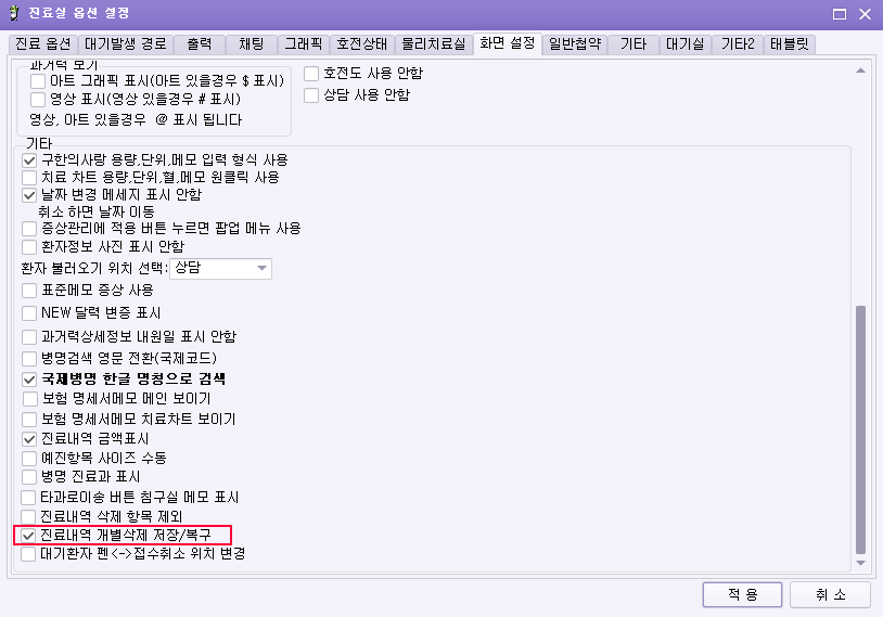 '진료내역 개별삭제 저장/복구' 옵션이 적용되면 실수로 개별 삭제된 경우 복구할 수 있습니다.