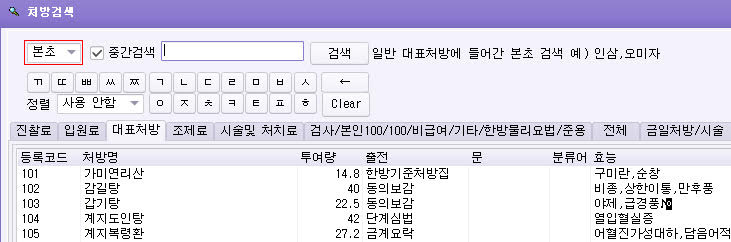 참고) 일반 대표처방에 들어간 본초를 검색 할 수 있습니다.