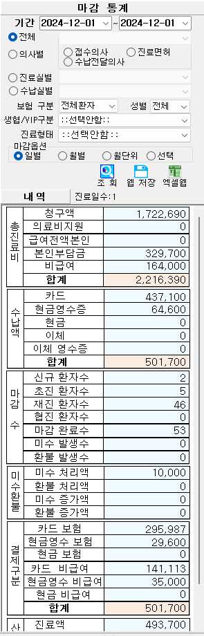 총진료비, 수납액, 미수 환불, 결제 구분, 산정액을 쉽게 확인할 수 있도록 개선했습니다.