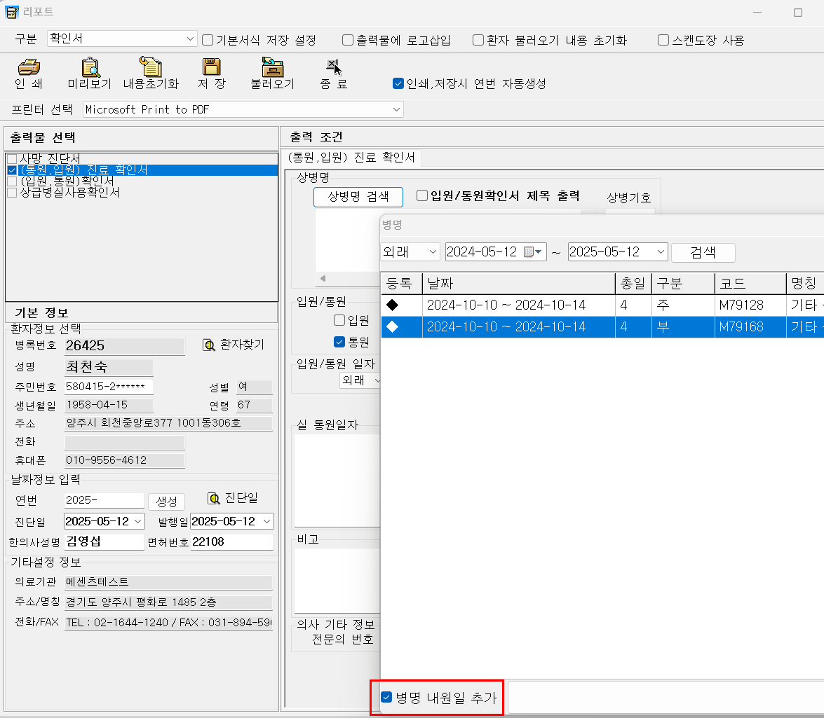기관의 요청에 따라 진료확인서에 내원일별 상병명이 추가되었습니다.