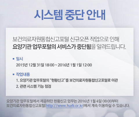 요양기관 업무포털 서비스 중단 안내 2015년 12월 31일 ~ 2016년 1월 1일